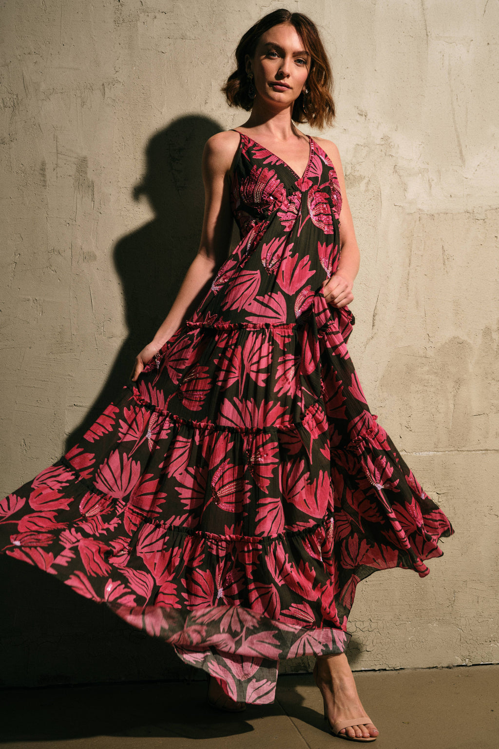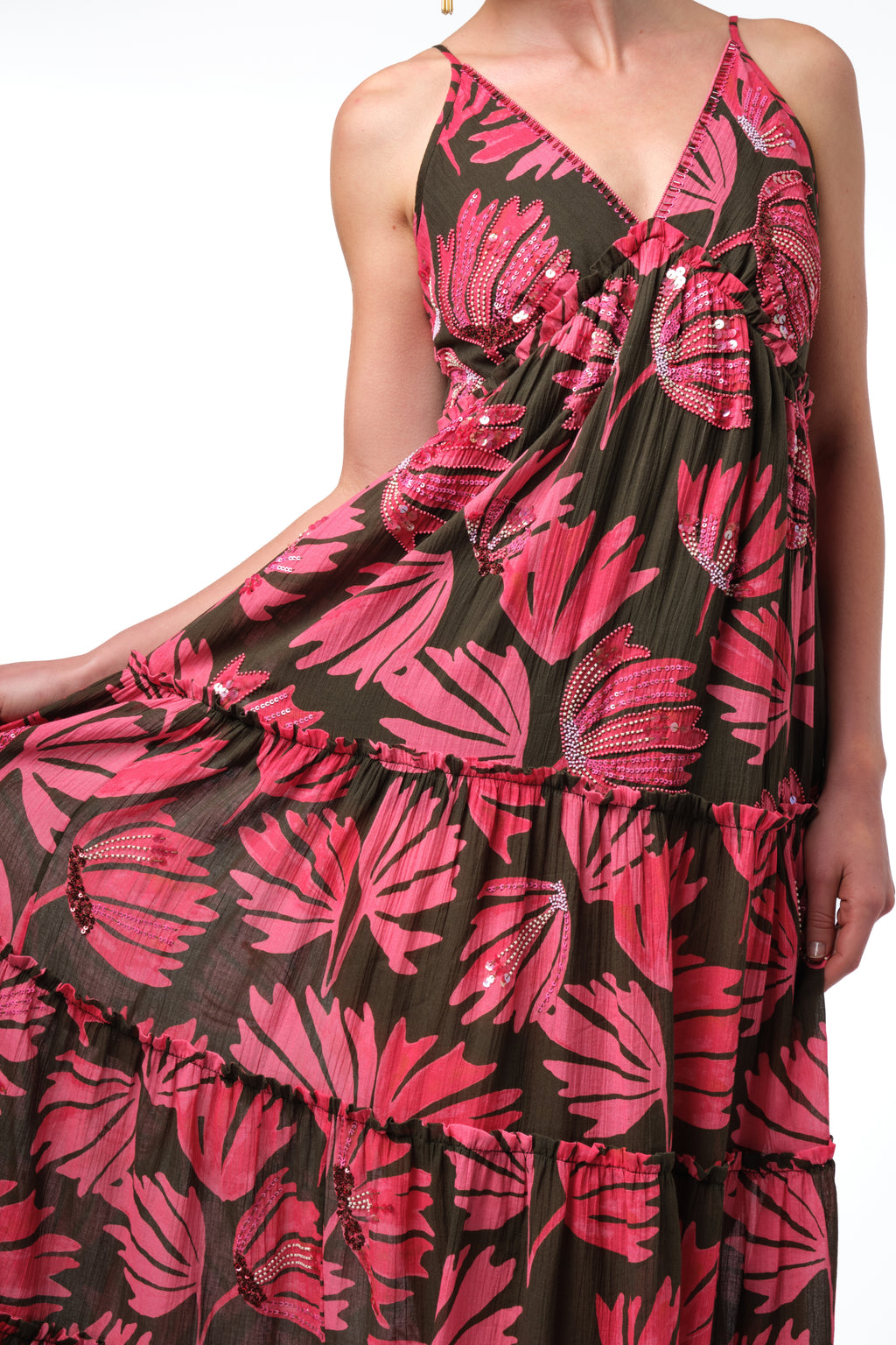 A tiered maxi dress crafted in lightweight crinkle cotton, featuring a deep V-neckline with adjustable straps and a flowing silhouette. Rendered in a pink leaf batik motif on a dark olive ground, the design is finished with subtle beading and embroidery throughout for added texture and dimension.