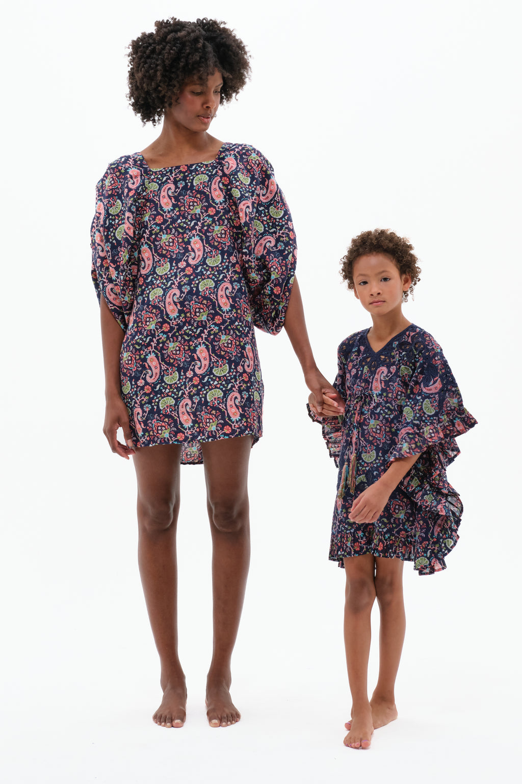 Minxy mini Iwona in Wallpaper Paisley Navy will keep you cool, in every sense. Dramatic, gathered Dolmen sleeves, keyhole closure in back and signature, unique block print. Cotton/linen can be hand washed or dry cleaned.. Made in India.