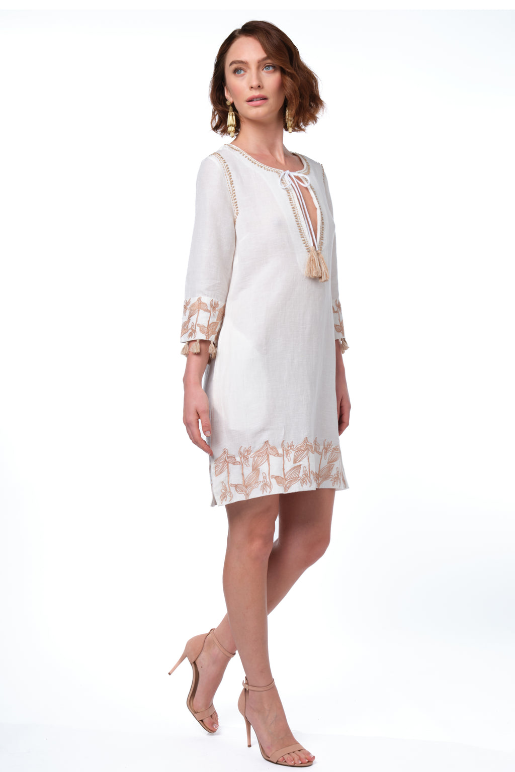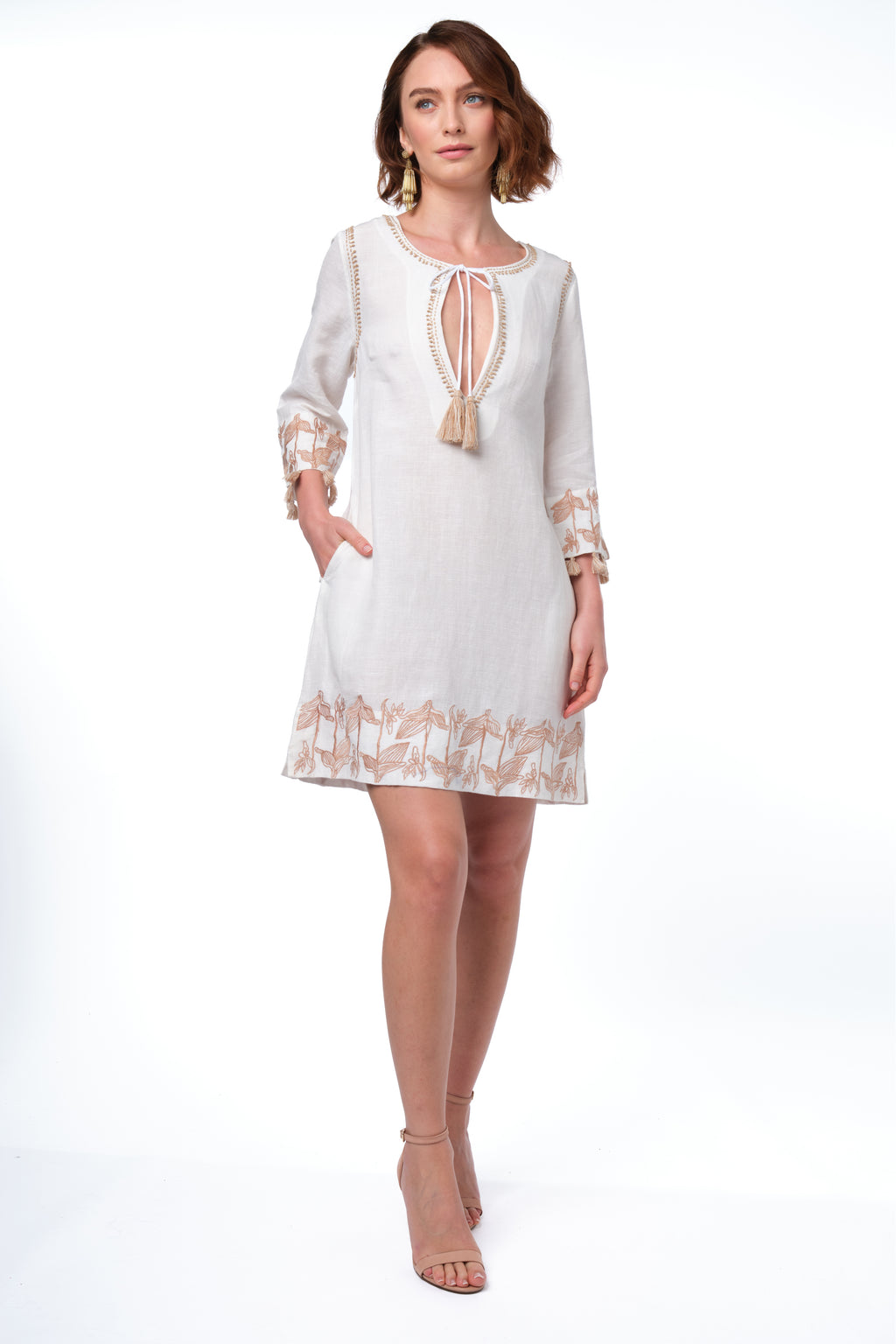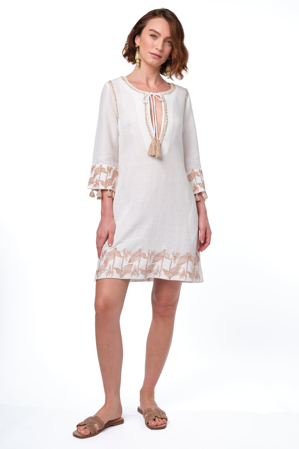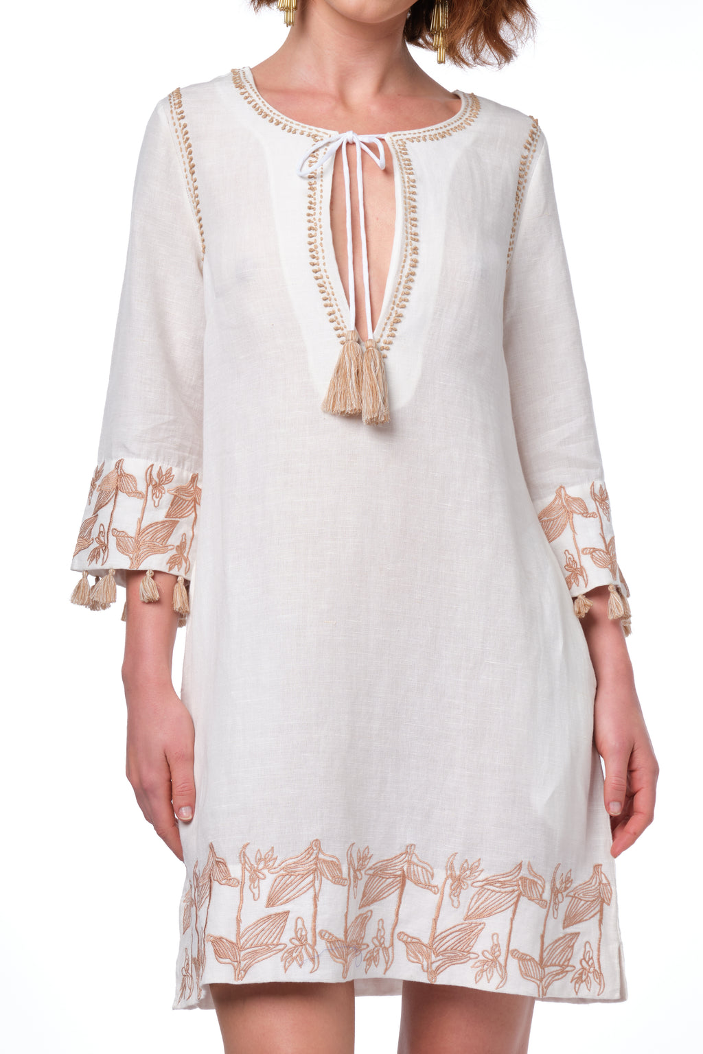 Relaxed yet refined, Nina brings artisanal charm to a timeless tunic silhouette. Crafted in airy ivory cotton with soft taupe embroidery, her neckline is accented with tasseled ties for that signature Calypso touch. Embroidered cuffs and hemline are finished with playful tassel trim, making Nina as breezy at the beach as she is chic in town.