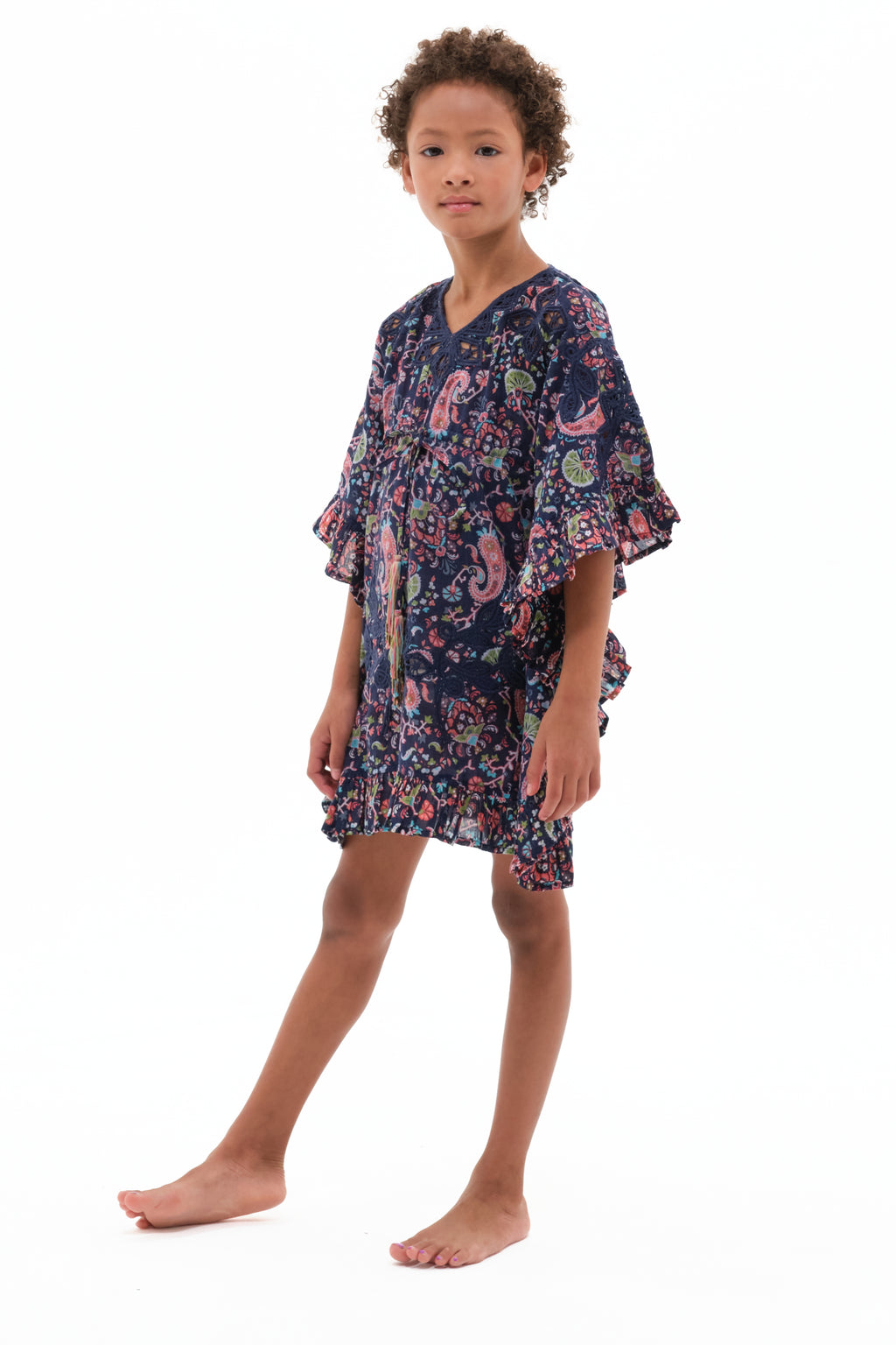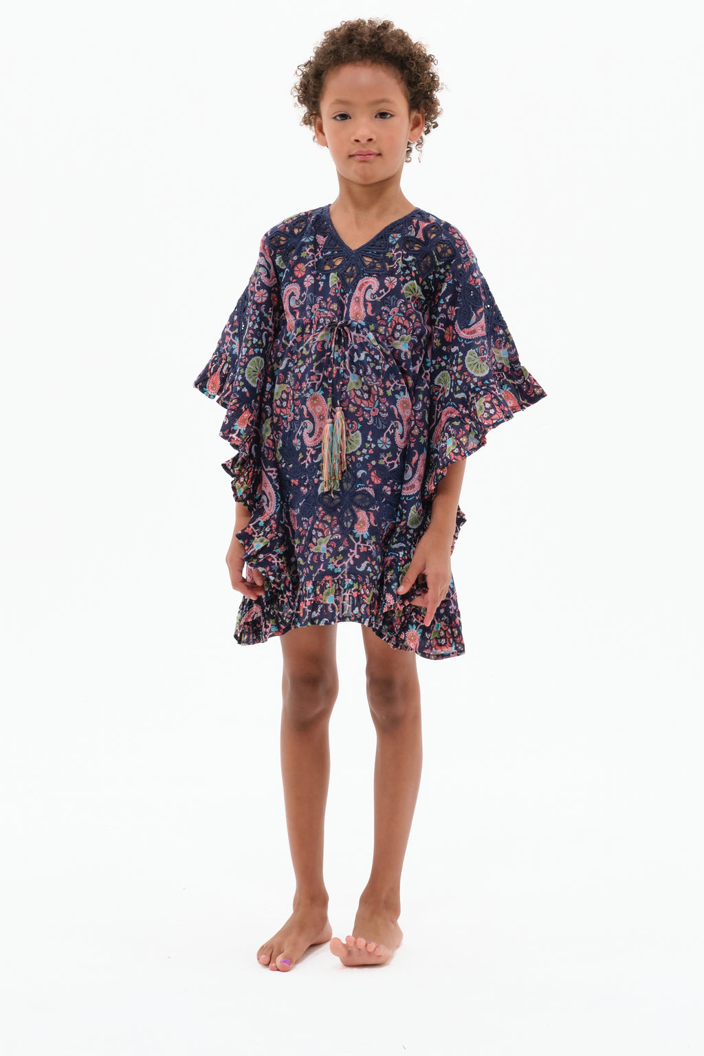 Add a playful touch to your little one’s wardrobe with the Mini Iwona Kids Kaftan in our limited-edition Wallpaper Paisley Navy. Designed to keep them cool and stylish, this breezy silhouette features gathered dolman sleeves, a back keyhole button closure, and Calypso’s signature hand-blocked print. Perfect for sun-soaked adventures, festive moments, or simply lounging in style.