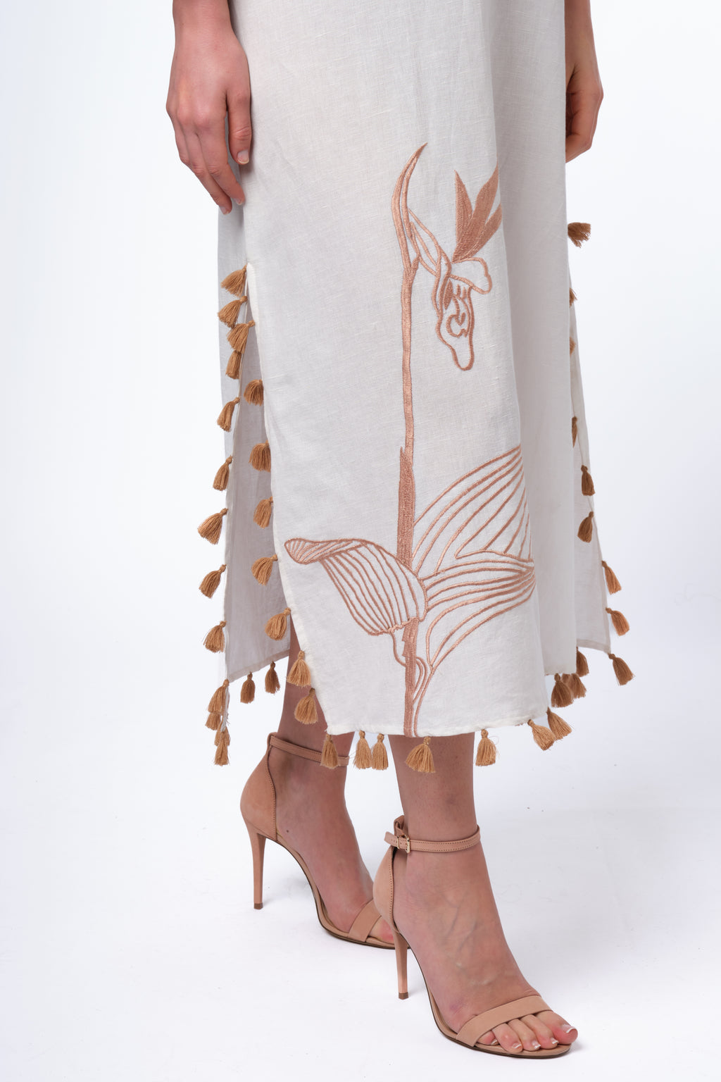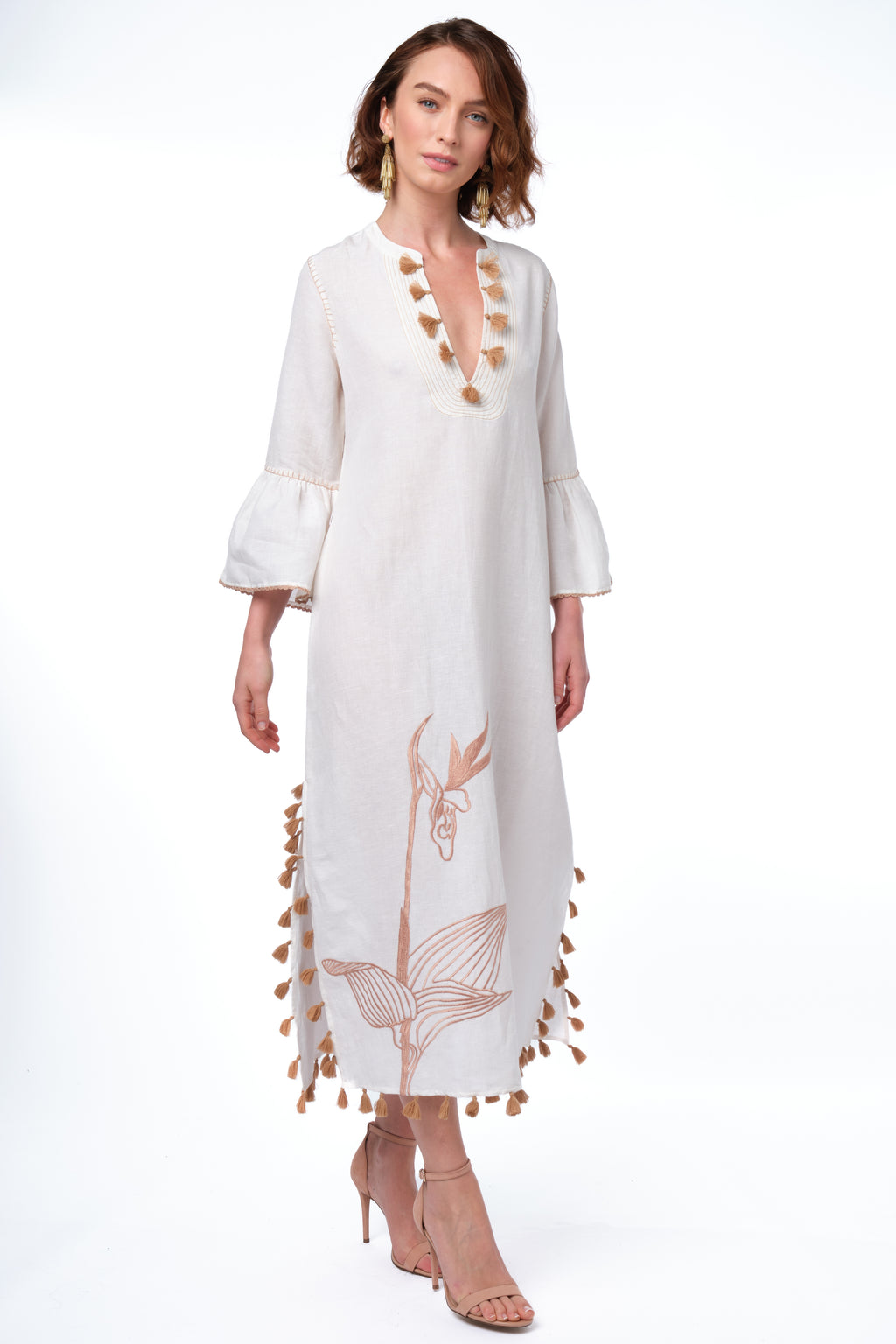 A midi-length kaftan crafted in a cotton-linen blend, designed with a deep V-neckline, three-quarter bell sleeves, and a relaxed silhouette. Rendered in ivory with tonal iris embroidery and finished with tassel detailing along the neckline, sides, and hem.